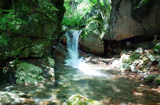 苔むした岩に腰かけて、ジュースを飲みながら滝を眺めます。さわやかに飛沫が顔にかかりますが、天然のミストは涼しくて気持ちいいです。