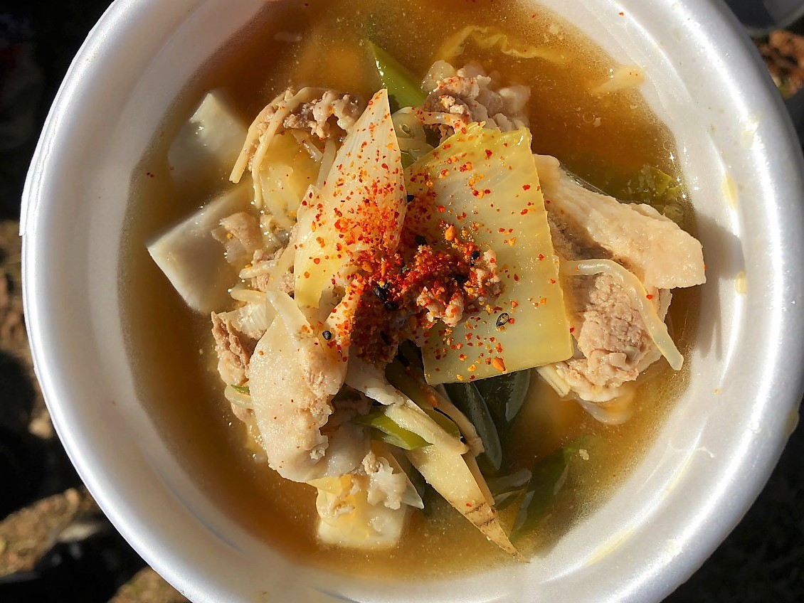 ストーブを3つセットし火力を高め、その上に大鍋を置いてトン汁をつくります。お肉も野菜もたくさん入っておいしいトン汁が完成。