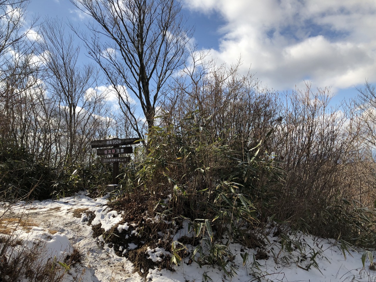 足元には若干の雪です。気温が低いので木陰には結構雪が残っています。知り合いがやっているブログなどもあって、直近の山歩きを見ていたら、年末に磐梯山に登った記録を見つけました。ただし、雪がかなり深かったらしく赤埴山の手前か先でラッセルに苦労して途中で引き返したとのことです。