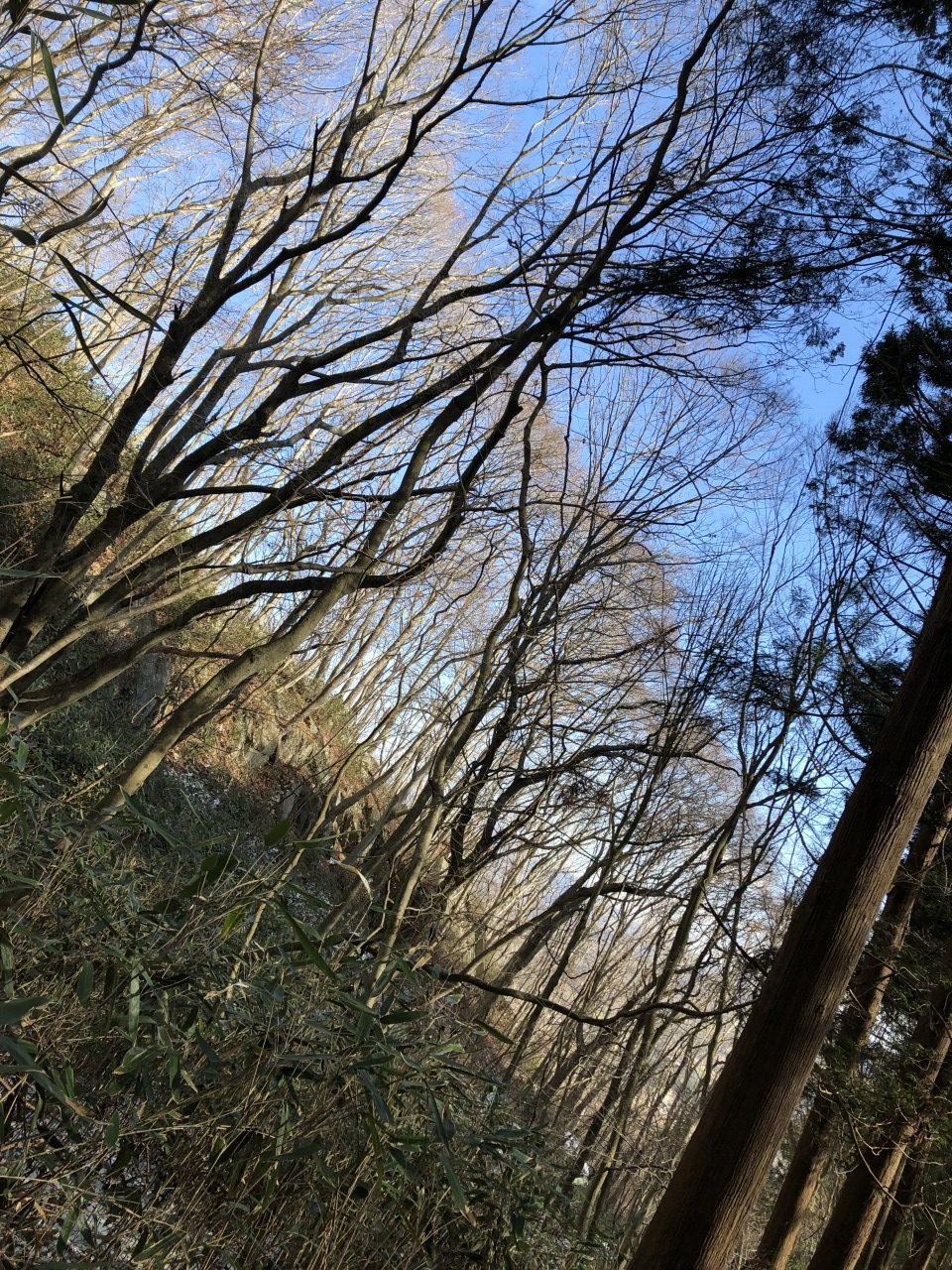 駐車場に降り立った時は、冷たい風が少し強く吹いていましたが、樹林帯に入ると風も当たらずポカポカの陽気で狙い通りの山歩きが楽しめそうです。ザックには重り以外に、テント、シュラフ、水とテント泊を意識した装備なので、最初の一歩から結構足がキツイです。自分の心臓の鼓動を聞きながら、一歩一歩歩いていきますよ。