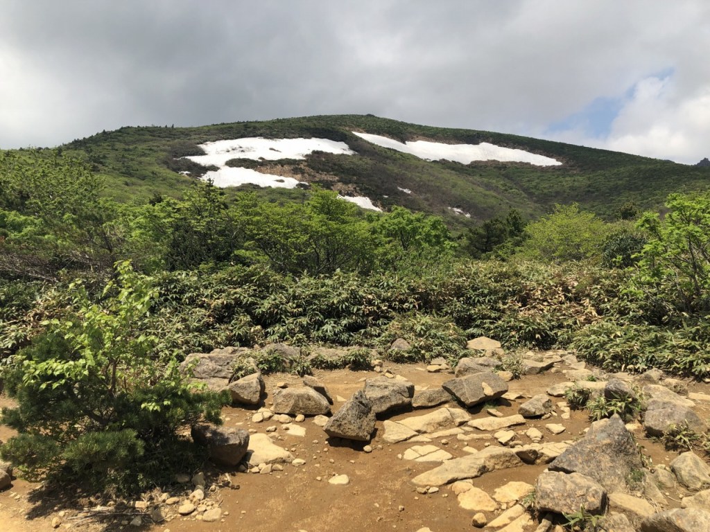 初夏の林を横目に見ながら歩きます。まだ6月1日ですが、安達太良も夏の装いですね。