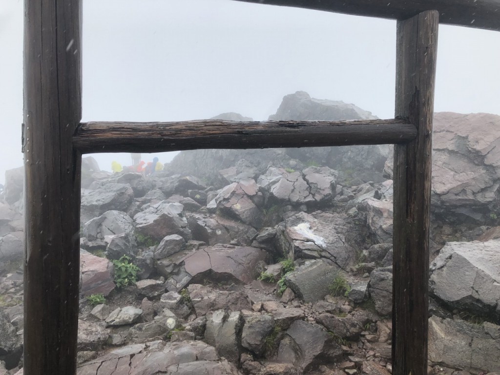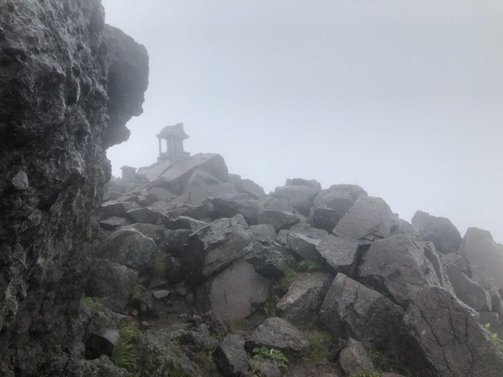 登山口の狛犬の間を通り過ぎしばらくは土の道が続きます。雨は弱く、靴が汚れるほどではありません。やがて視界が開け右手に朝日岳が見える位置に到着しました。足元も土の道から岩場に変わりました。晴れていれば荒々しい朝日岳が見えるはずですが、真っ白な雲に隠れて何も見えません。しばらくは足元だけを眺めて峰の茶屋に到着です。