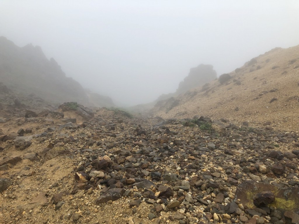 さてさて、温泉を楽しみに下山しましょう。ちょっと体も冷えてきました。ガスで先が見えないこの景色も山にいるって感じでうれしいですね。(この感覚ちょっと変でしょうか?)(^^;
