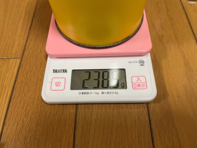移し替え前の状態です。重さが238.5グラムあります。ほとんどからの状態ですね。