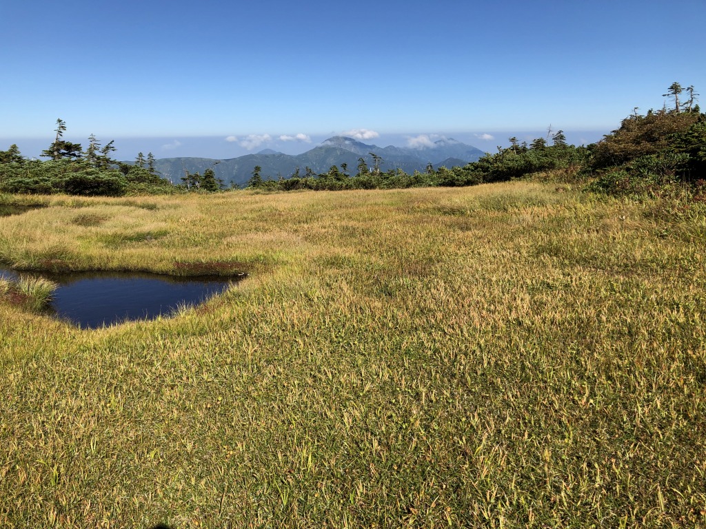 黄色と緑が交わった草が目の前の斜面を下りて対面の平ケ岳に続いています。